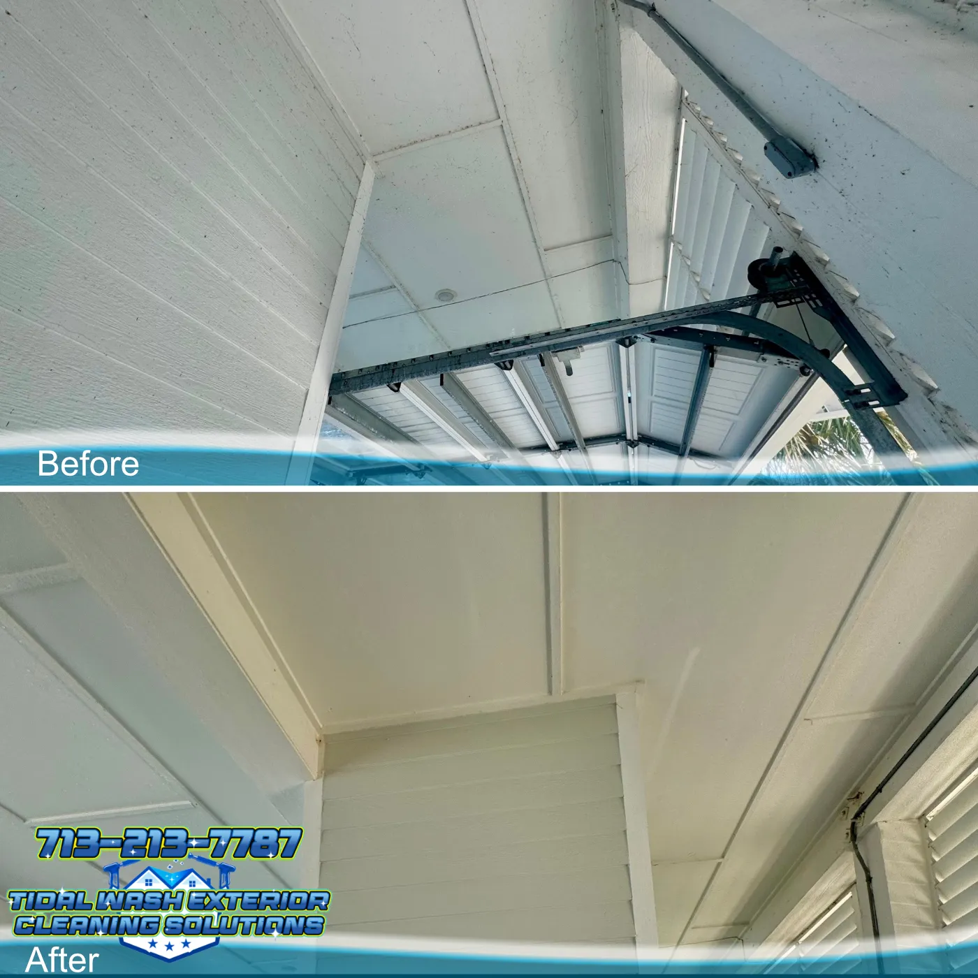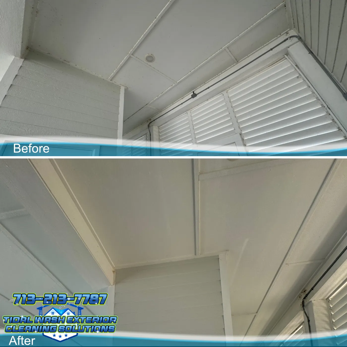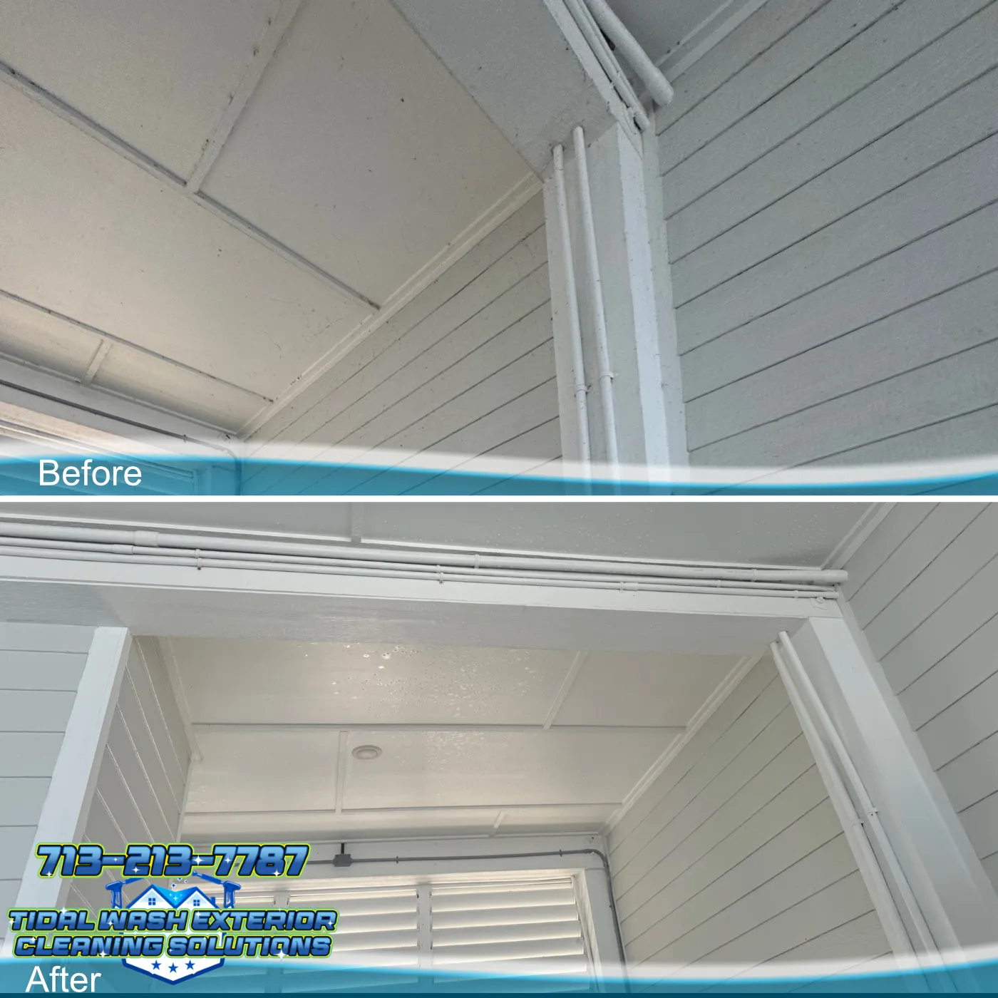 Tidal Wash Exterior Cleaning Solutions transformed this Galveston patio with a professional softwash process that removed insect nests, grime, and buildup, restoring a like-new appearance.